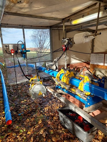 Arbejdet forløber planmæssigt og udføres af vores egne medarbejdere, som både står for svejsning af rør og gravearbejdet. Vi forventer at være klar til at tilslutte de nye forbrugere til vores ledningsnet den 5. januar, hvor aktiver og forpligtelser er overdraget til Vandcenter Djurs.
